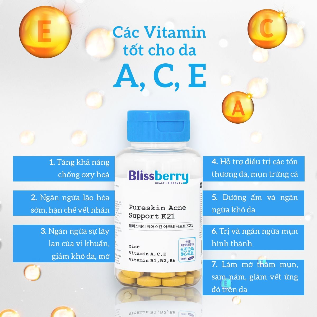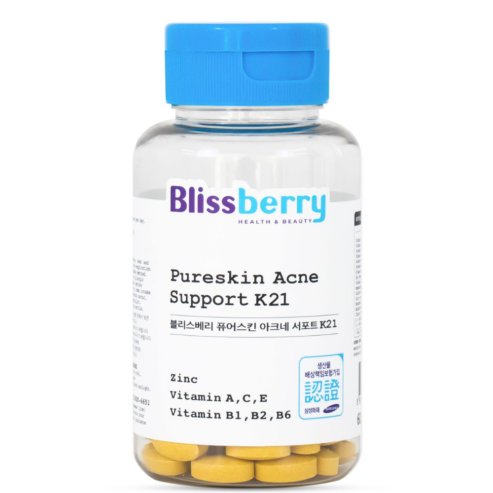 Viên uống giảm mụn Blissberry Pureskin Acne Support K21 60 viên
